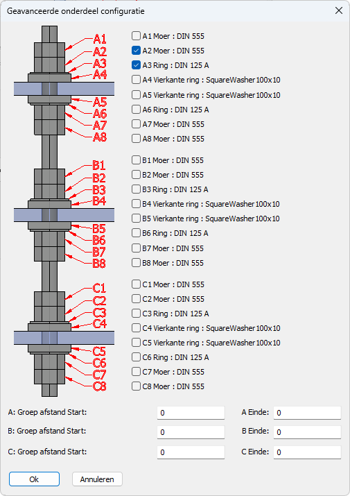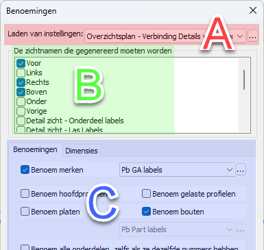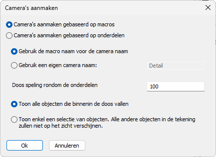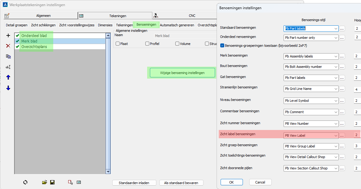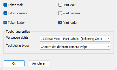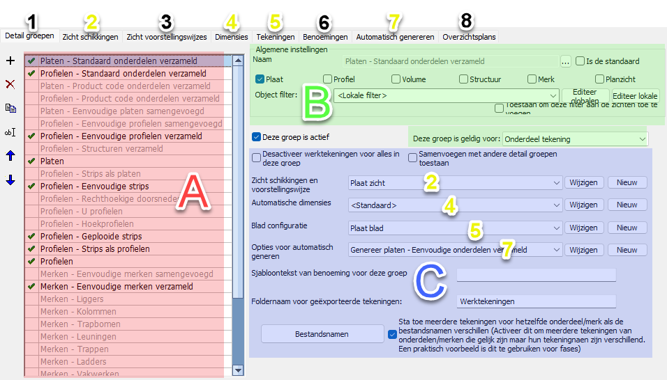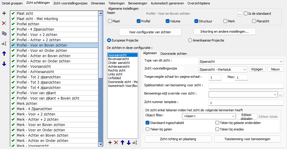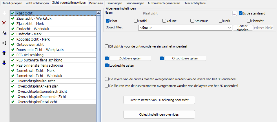 De Algemene instellingen bepalen voor welke onderdeel- en merktypes de zichtschikkingen zijn bedoeld. Dit wordt niet gebruikt als filter voor het genereren van werktekeningen, maar wordt door het dialoogvenster gebruikt om te bepalen welke detailgroepen en montageplans deze instellingen-collecties kunnen gebruiken.