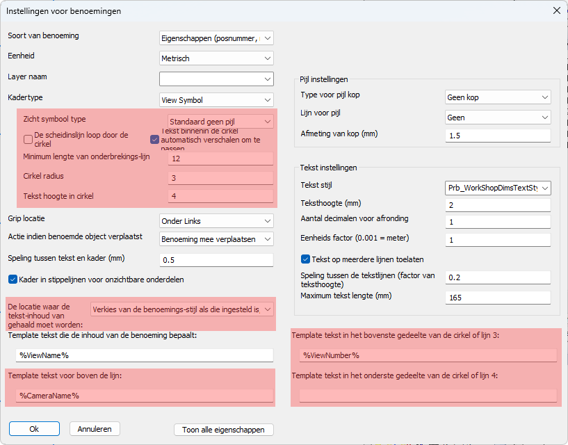 Sjabloontekst van benoeming voor zicht - Gebruik deze sjabloontekst om een benoeming onder dit zicht toe te voegen om het zicht te beschrijven. Dit wordt standaard gebruikt voor eindplaat- en doorsnedezichten in merken, of voor overzichtsplans. Een algemene benoeming voor het hele onderdeel of merk kan worden ingesteld op het tabblad Detailgroepen.