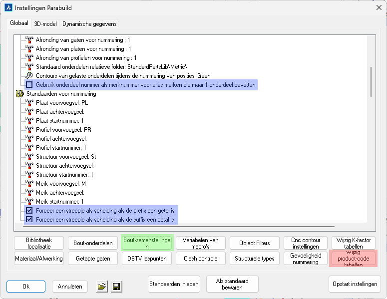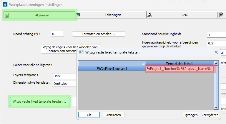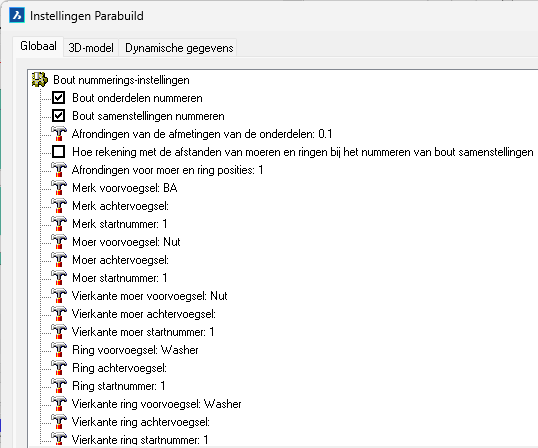 Dit zijn alle instellingen die Parabuild van boven naar beneden doorloopt wanneer een werkplaatstekening voor een onderdeel moet worden gegenereerd.