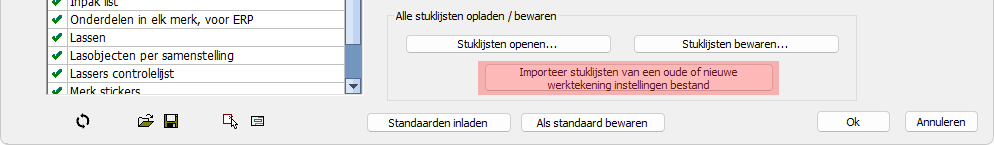 - Als u de stuklijstinstellingen van versie 7 in uw v8 werkplaatsinstellingen wilt importeren, kunt u deze knop op het tabblad stuklijsten gebruiken: