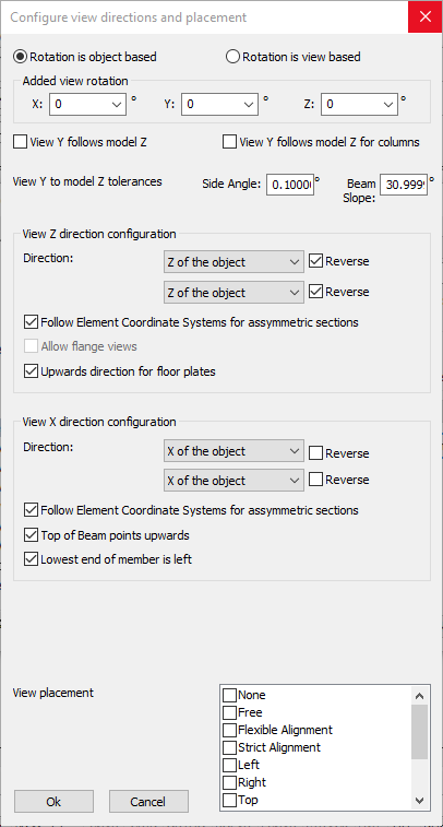 When enabled, all of the 'Top of Steel' faces of beams in 3D will always be drawn upward on the view no matter what the other direction options are set to in this dialog. - Lowest end of member is left - This is an override of the above View X direction option.