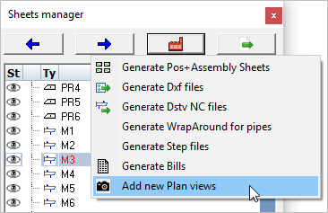 We begin by opening the Sheets manager from the Main - Output menu. Press the Generate button to open the drop-down options, and select Add new Plan views
