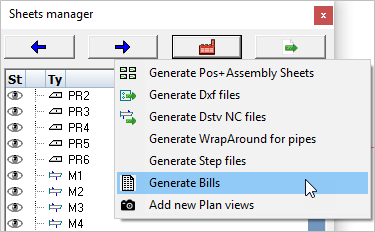 To generate all bills, open the Sheets manager from the Main - Output menu. Press the Generate button to open the drop-down options, and select Generate Bills you will be prompted to update the revision from the Revision manager or Continue without locking. In this case Continue