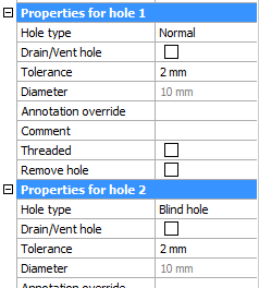Annotation override : When you enter a text in this field, this text will always be shown in the annotation of this hole on the position shop drawing. It will override the default text which would be the diameter, slotted, countersunk and thread information if it is such a hole type.