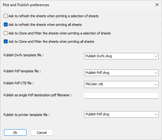 Publish Pdf CTB file - When publishing a set of sheets to a single PDF file through Right-clicking or the Printing all sheets method, this CTB file will be used. These 2 publishing methods do not ask for the CTB file so this is the only place where the choice can be changed.