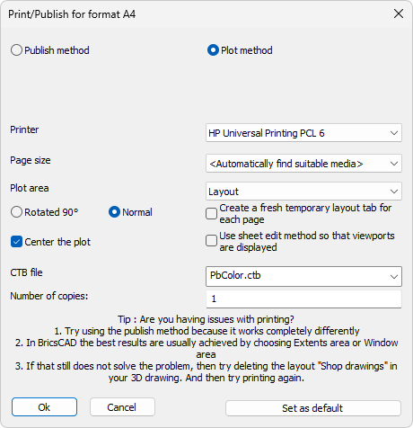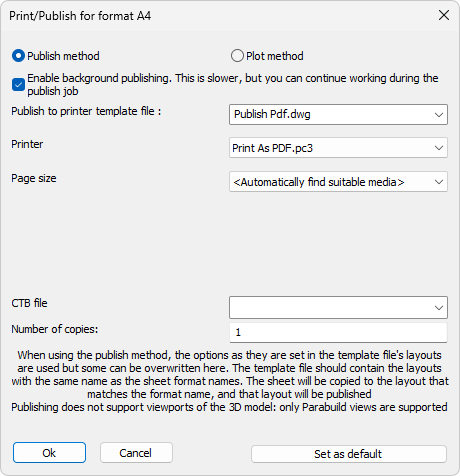 Publishing works differently : Each sheet that needs to be printed is prepared and stored separately as a dwg file, after which each dwg file and it's layout are sent to the publish mechanism in AutoCAD/BricsCAD. This method keeps the current 3D model out of the printing process which makes the printing process more consistent. This method also allows the sheets to be printed in the background while you continue your work in the 3D model.