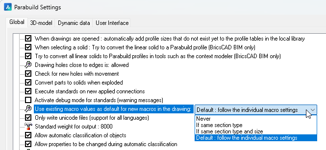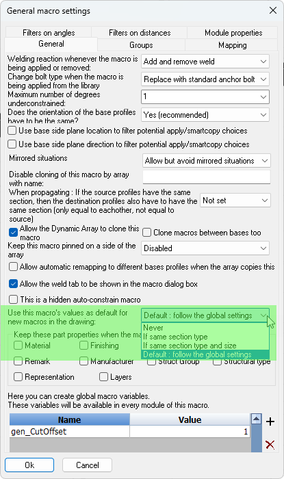 Default : follow the individual macro settings - Whether defaults from existing macros is disabled or not is determined by each macro in the library. The setting inside the macro is explained below. But the default of each new and old macro is set to default there too. This effectively means that it is enabled as "If same section type and size".