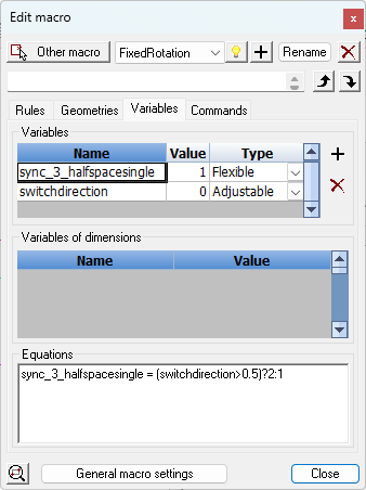 - sync_ : When you use sync_ then the value of the variable will be used to change the enumeration of the constraint . You should use a Flexible variable in this case, NOT an Adjustable or Fixed variable. The value will be filled in by Parabuild just before the module is calculated, and during calculation of the module this variable's value is calculated and pushed into the enumeration of the constraint which can directly influence the geometry.