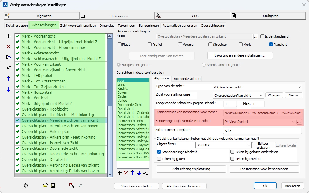 Het tekeningen tabblad bevat alle instellingen voor de werktekeningen en overzichtsplans.