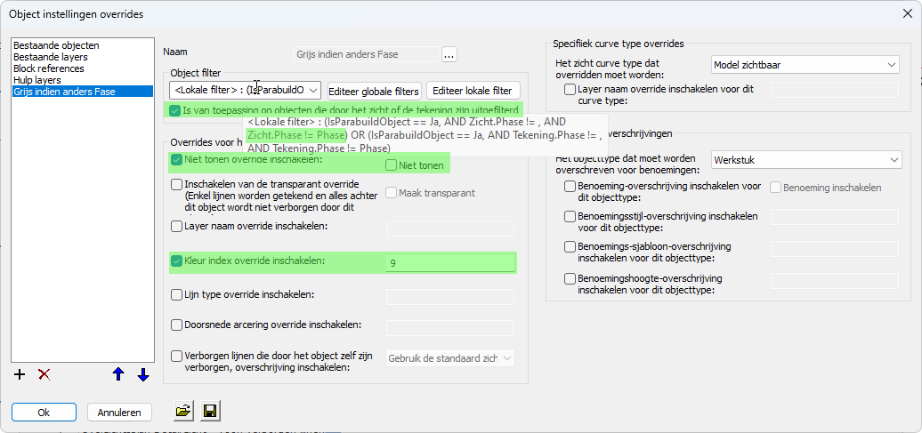 Lokale filter - Deze filter is ingesteld om alleen op Parabuild-objecten te worden toegepast, maar belangrijker is het filter "Zicht.Phase != Phase": Dit betekent dat de fase van het object niet hetzelfde kan zijn als de fase van het zicht om deze filter waar te maken. De zicht fase wordt opgehaald uit het fase filter dat voor het zicht is ingesteld.