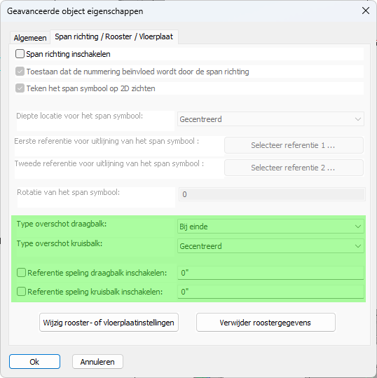 Dit commando maakt roosters en vloerplaten op basis van een plaat met een vrije vorm, voorheen was dit beperkt tot strips/panelen. De rooster- of vloerplaatgeometrie wordt dan altijd op de plaat weergegeven in 3D- of 2D-zichten - indien toegestaan door de zicht-instellingen van het zicht.