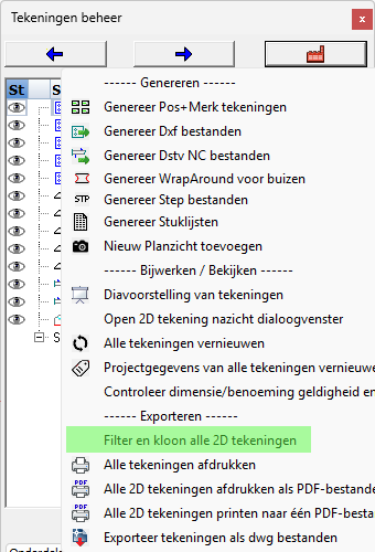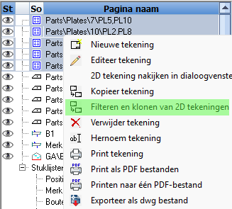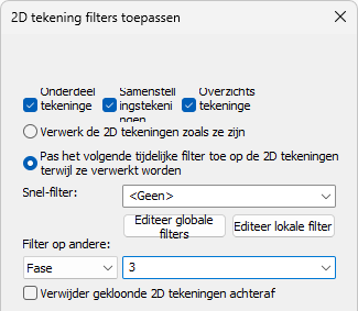- Met Filter en klonen van 2D tekeningen kunt u kopieën maken van een bepaalde subselectie van 2D tekeningen, zoals een bepaalde fase. De gekloonde 2D tekeningen bevatten het juiste aantal onderdelen voor het filter dat u hebt gekozen, en 2D tekeningen die door de filter geen onderdelen meer hebben, worden overgeslagen. Hierdoor hoeft u minder 2D tekeningen te maken en nakijken, en worden de gefilterde tekeningen enkel aangemaakt wanneer het nodig is.