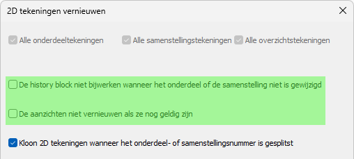 Let op dat wanneer u tekeningen wilt vernieuwen die zijn gemaakt met een oudere versie van Parabuild, het het beste is om vóór het maken van modelwijzigingen eerst de oude tekeningen te vernieuwen met deze 2 instellingen uitgeschakeld om een volledige vernieuwing af te dwingen en alle zichten bij te werken naar de huidige versie: