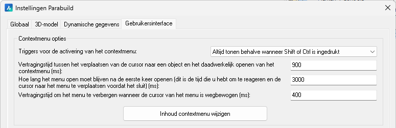 U kunt het menu uitschakelen of het gedrag ervan aanpassen in de Parabuild globale instellingen.