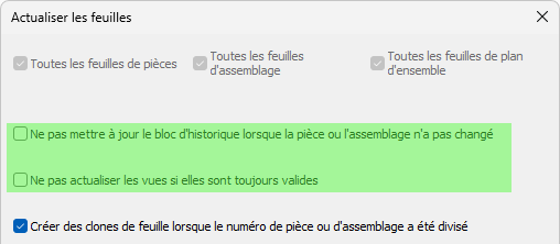 Une autre nouvelle option permet de copier automatiquement les feuilles lors du rafraîchissement lorsqu'un numéro de pièce ou d'assemblage a changé et s'est scindé en 2 ou plusieurs pièces/assemblages différents avec des numéros différents. Ces copies seront chacune mises à jour pour leurs nouvelles géométries respectives.