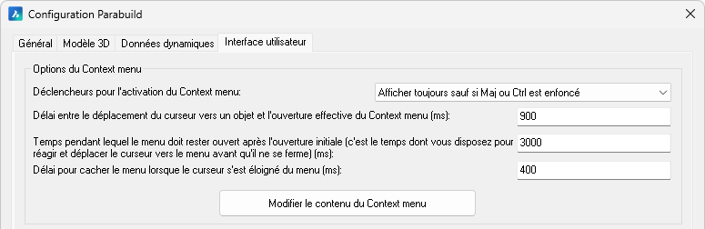 Par exemple, si vous trouvez que le Context menu s'ouvre trop souvent, vous pouvez augmenter le délai d'ouverture ou choisir la touche Maj comme déclencheur à maintenir avant l'ouverture du Context menu :