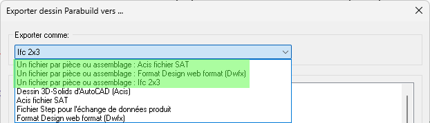 - Exportez des fichiers individuels par pièce ou par assemblage (Ifc, Dwfx ou SAT) à distribuer avec les plans d'atelier et fichiers CNC, ou pour l'import dans des solutions ERP ou cloud.