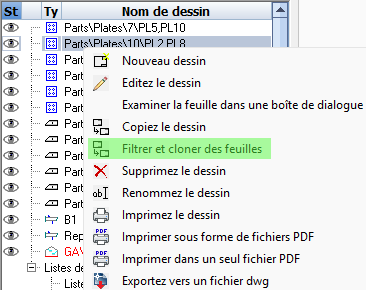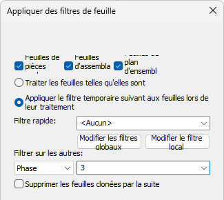 - Filtrer et cloner des feuilles permet de faire des copies d'une sous-sélection de feuilles, comme une phase particulière. Les feuilles clonées contiendront le nombre correct de pièces correspondant au filtre choisi, et les feuilles sans pièces filtrées seront ignorées. Cela permet des flux de travaille avec moins de feuilles à créer et nettoyer, en générant les clones filtrés uniquement quand nécessaire.