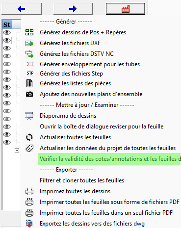 - Le nouvel outil vérification de validité des feuilles recherche des erreurs telles que deux feuilles pour une même pièce, feuilles manquantes, feuilles obsolètes, ou cotes non connectées. Cela aide à éviter la surproduction, la sous-production ou la production de pièces erronées.