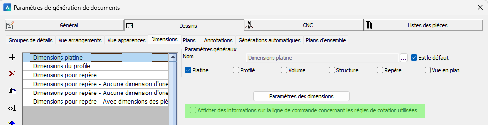 Les paramètres de cotation pour les platines, les profilés et les assemblages incluent les nouveaux réglages suivants :