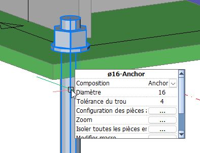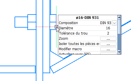 - Lorsque vous déplacez le curseur sur un boulon dans une vue 2D, vous pouvez changer le diamètre, ouvrir le macro auquel appartient le boulon, ou ouvrir le dessin d’atelier d’une pièce, le tout depuis une feuille.